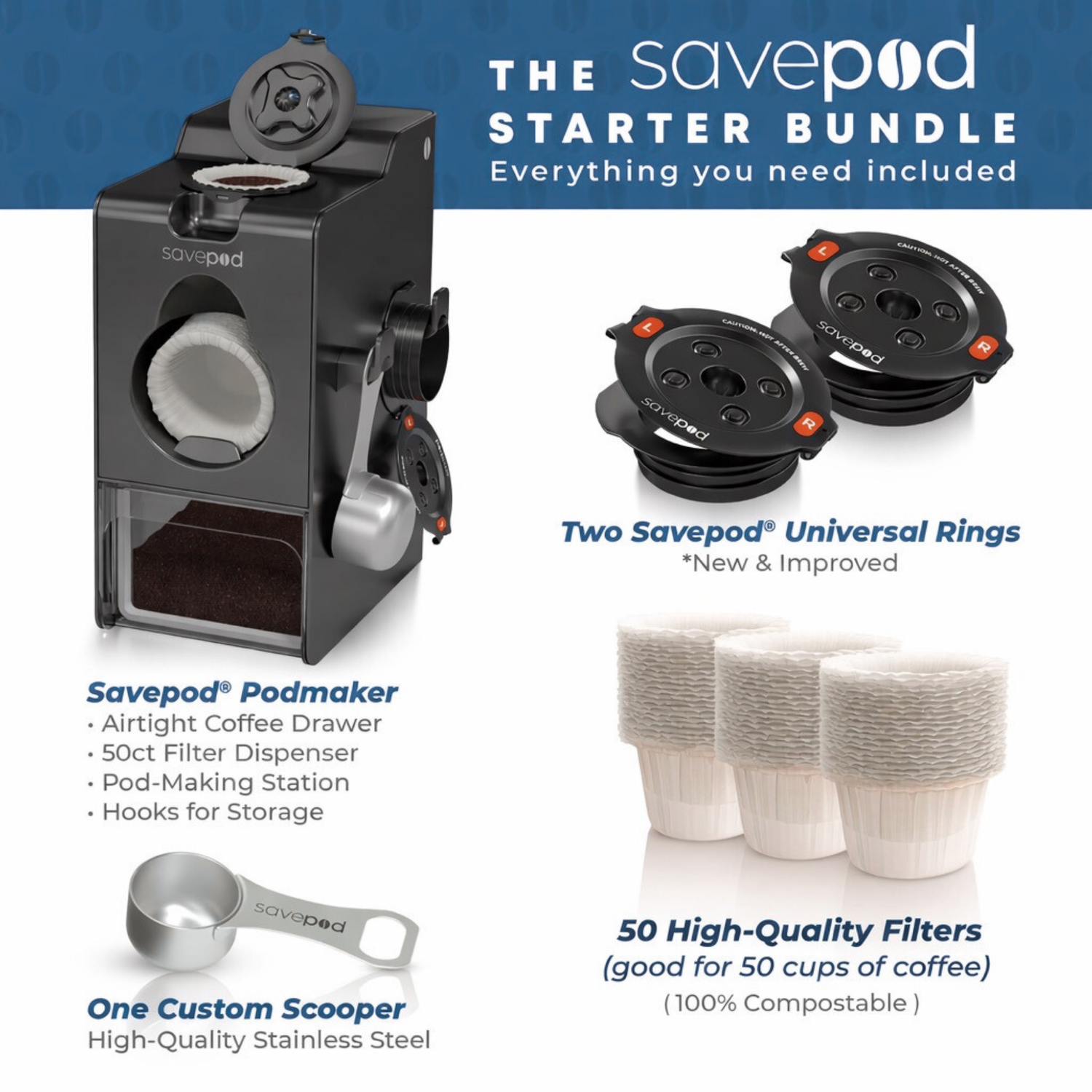 Meet the world’s first coffee PodMaker – The convenient & eco-friendly way to brew premium coffee. ✔ Works with Keurig® KCup® Brewers & more ✔ Easy Clean-Up – Pop open the ring and 100% compostable filter and grounds fall out ✔ Save average $700/Year ✔ BPA-free, food-grade, dishwasher safe. ✔ Eco-Friendly – Each SavePod replaces a plastic pod. Enjoy fresh coffee, fast cleanup, save money & zero guilt