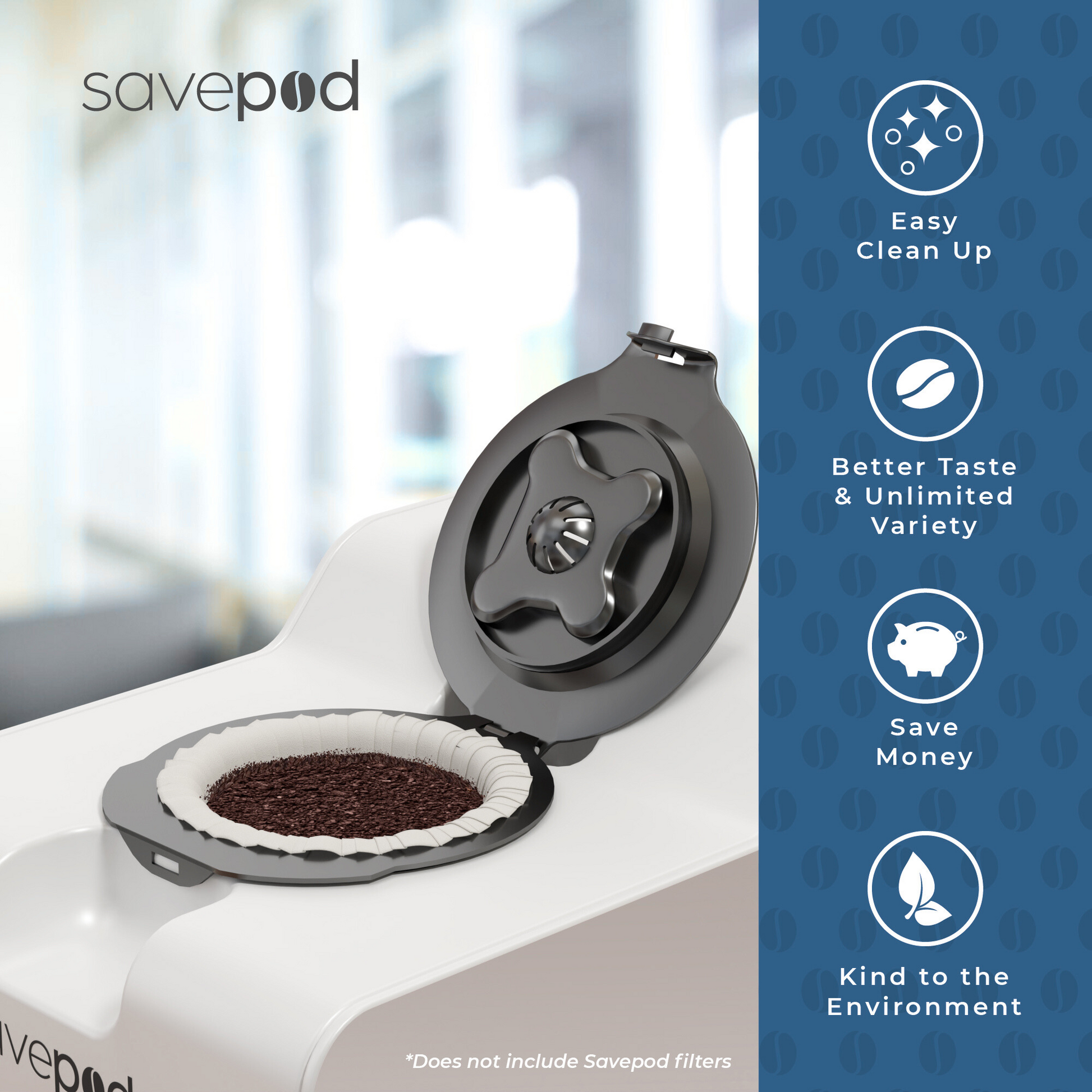 Meet the world’s first coffee PodMaker – The convenient & eco-friendly way to brew premium coffee. ✔ Works with Keurig® KCup® Brewers & more ✔ Easy Clean-Up – Pop open the ring and 100% compostable filter and grounds fall out ✔ Save average $700/Year ✔ BPA-free, food-grade, dishwasher safe. ✔ Eco-Friendly – Each SavePod replaces a plastic pod. Enjoy fresh coffee, fast cleanup, save money & zero guilt