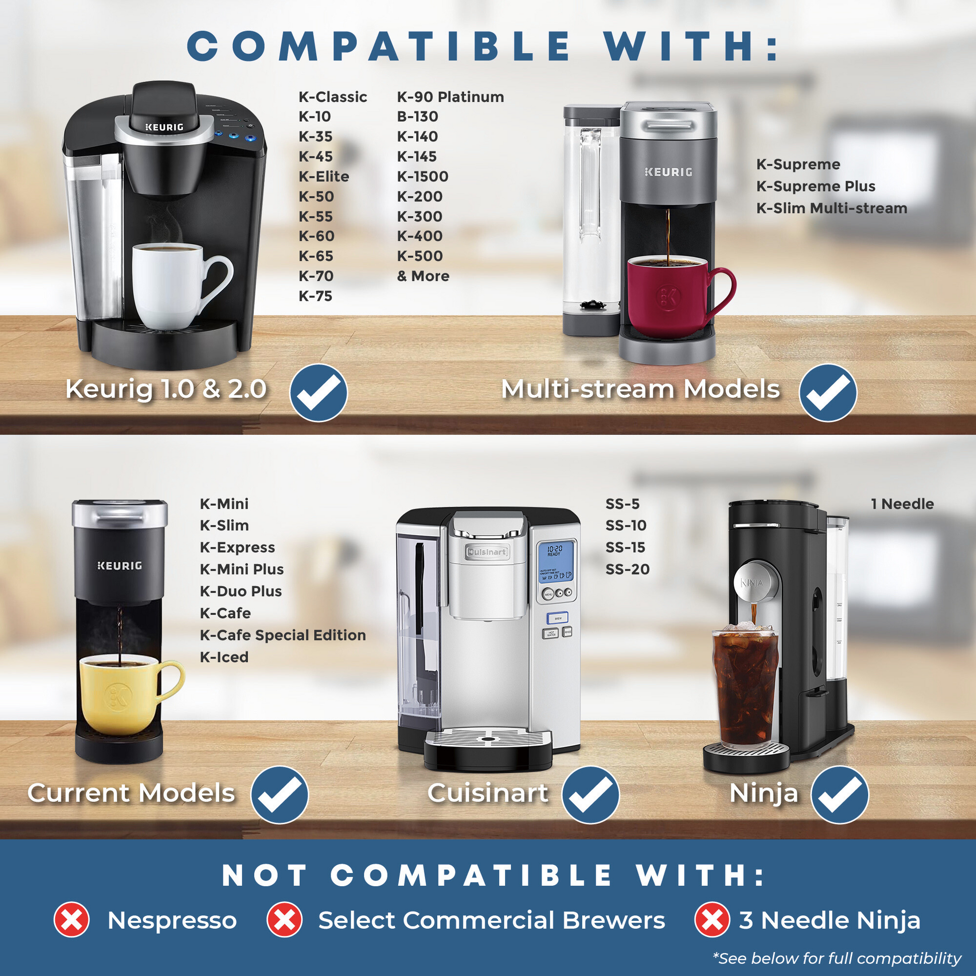 Savepod 1-Hole Ring is compatible with most K-Cup® 1.0, 2.0 and K-Supreme® brewers. As well as 1-needle Ninja® brewers and most Cuisinart® Brewers. See compatibility chart for more details.